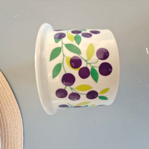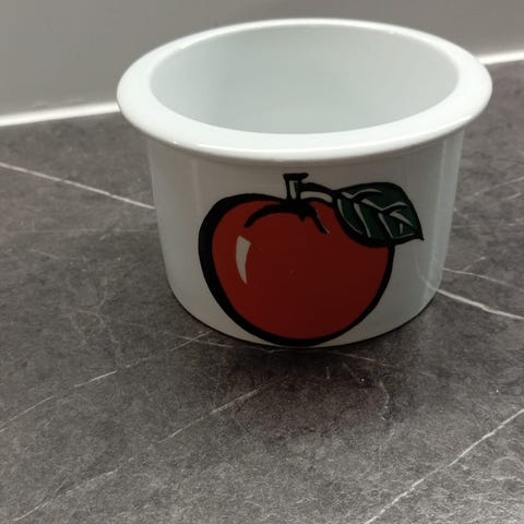 Mansikka kuvioinen pomonapurkki, 9cm korkea. Ehyt ja siisti, kirkas kuva. Ei krakeloitumaa. Sisällä lasitteen alla pieniä pisteitä yhdessä kohtaa.