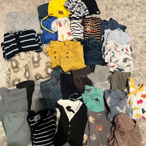 Myydään pakettina Ralph Lauren veluuritakki ja kauluspaita, Hugo Bossin trikoopaita ja kahdet chinohousut (siniset H&M ja harmaat Mayoral). Housuissa säädettävät vyötäröt. Kaikki hyvässä käytetyssä kunnossa, ja pesty hajusteettomasti.