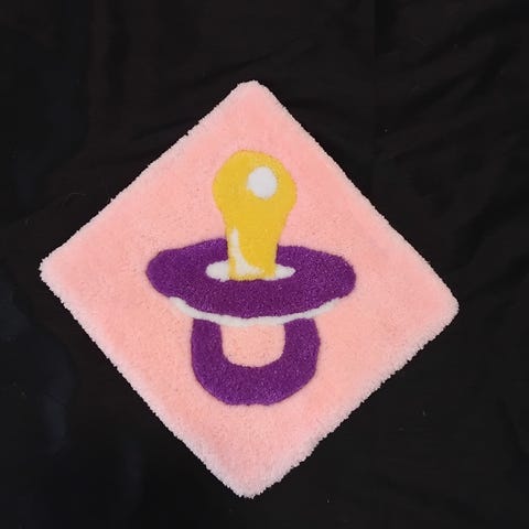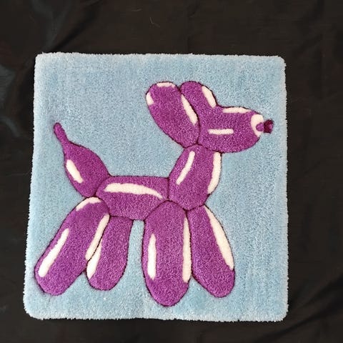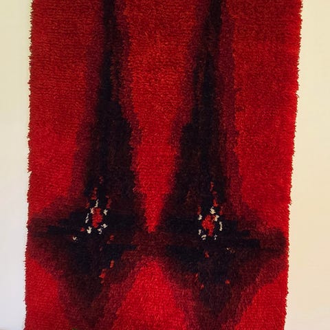 Ryijy akryylilangasta. Takana huopa ja ripustusrenkaat.