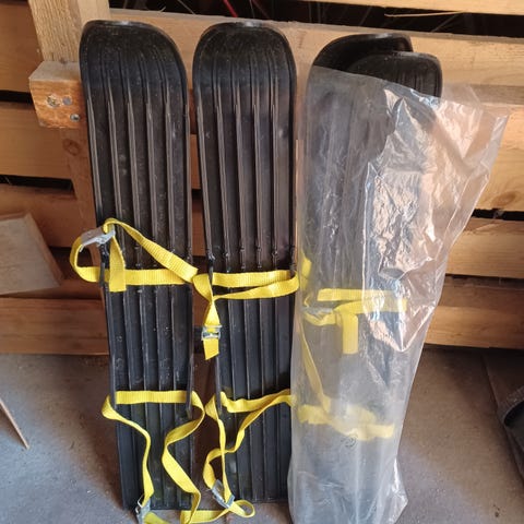 80-luvun "hittituote" minarit eli muoviset minisukset, toisessa suksessa pore (kuva), suksien pituus 63 cm