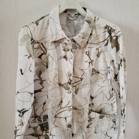 Betty Barclayn farkkutakkimallinen jakku ohuesta puuvillasta. Väri puhtaan valkoinen, naisten koko 38. Takissa on metallinapillinen edestä suljettava malli ja pitkät hihat, jotka voi tarvittaessa kääriä. Kunto vastaa uutta, on jäänyt vaille käyttöä. Sopii hyvin yhdistettäväksi vaikka mekkojen tai hameiden kanssa.