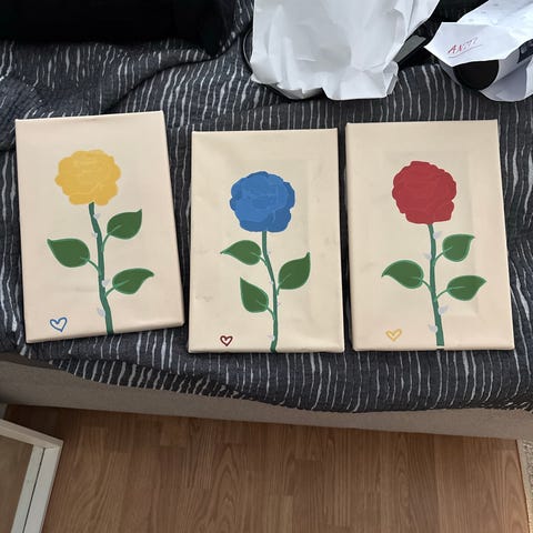 Maalaus, jossa on värikkäitä kukkia ja sydämiä vaalealla taustalla. Teos esittää kukkakimppua, jossa on vaaleanpunaisia, keltaisia ja vihreitä sävyjä. Maalaus on koristeellinen ja sopii sisustukseen kuin sisutukseen.