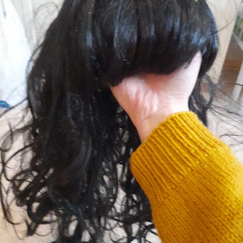 Synteettistä materiaalia olevat 35 cm pitkät hiukset. Materiaali kestää föönäyksen ja kuivatuksen 150 `C.
