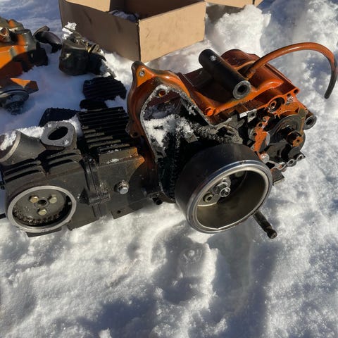 Mönkijän moottori varaosiksi tai kunnostukseen. Pyörii eli ei jumissa. Mukaan ohjaustanko kaasari ym. Vain nouto ei lähetystä.
