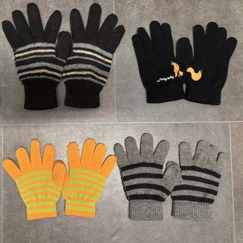 Lasten kirjavat, käsintehdyt hanskat. Hienot! Vaikka pukinkonttiin. Kapeat on ranteesta, joten minun mielestä ala-astelaiselle menee parhaiten. Tarkempia koko tietoja ei ole.