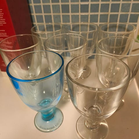 Kerttu Nurmisen suunnittelemat juomalasit. Laseissa hentoa naarmua
