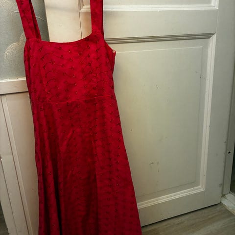 Mekko on ehjä, yksi paljetti puuttuu edestä ylhäältä.