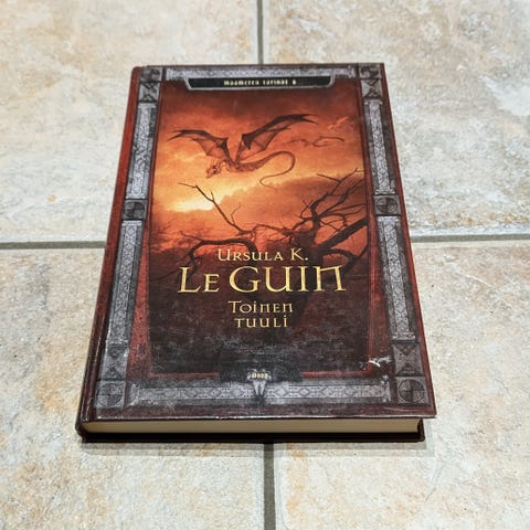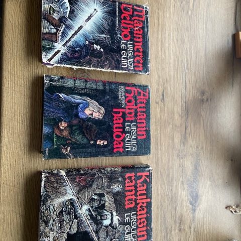 Ursula K. Le Guin Maameren tarinat 1-3 , 2.painos. Kyseessä on kolme kirjaa sisältävä kokoelmateos, joka sisältää kirjat Maameren velho, Atuanin holvihaudat ja Kaukaisin ranta. Kirja on kovakantinen. Kirja on käytetty ja siinä on kulumaa kulmissa ja reunoissa, kuten kuvissa näkyy.