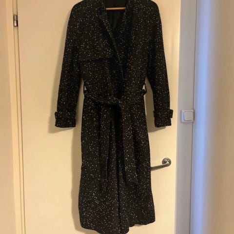 Takissa on pitkä malli. Kiinnitys napeilla ylhäältä alas. Vyötäröllä vyö. Materiaali on yhdistelmä kahta eri kangasta. Lisätietoja kysymällä :).