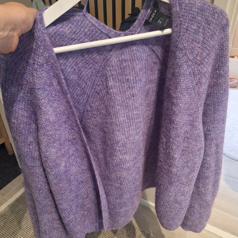 Violetti lyhyehkö villaneuletakki (80% lampaanvillaa, 20% polyamidia. Kaunis, mukava ja lämmin.