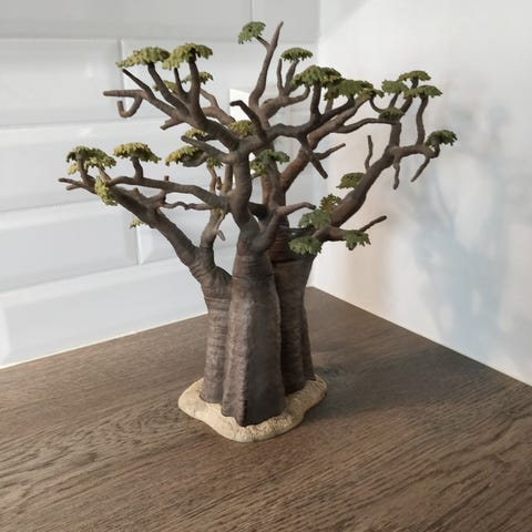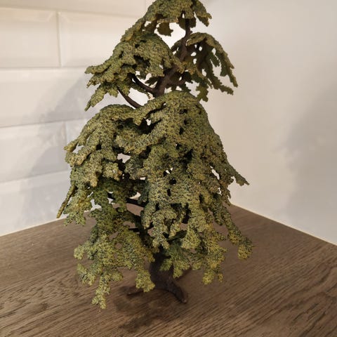 Schleich tammi puu. Runko on jaettu kahteen osaan ja sitä ei ole liimattu. Lehtiosat myös irralliset ja voi asetella runkoon mieleisellä tavalla. Eivät pysy kunnolla paikoillaan, ei siis kestä mitään rajuja leikkejä. Kahdessa viimeisessä kuvassa olen ympyröinyt mikä heikentää paikoillaan pysymisen. Jos haluaa lehdistön pysyvän paikoillaan paremmin, niin vinkkinä liimaus, kuten tuossa pyökki puussa on tehty. Tässä puussa yksi oksa, johon ei tule lehtiä (näkyy kuvissa). Korkeutta puulla on noin 26 cm ja leveyttä oksilla noin 18-22 cm riippuen miten lehdet laitettu paikoilleen ja mistä kohtaa mittaa.