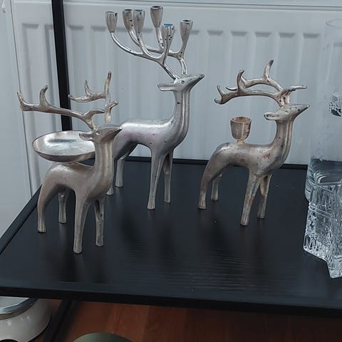 Pentikin hopeoitu poro kynttelikkö. Korkeus 30 cm. Myös paketti polttamattomia kynttilöitä mukaan. Niistä ei kuvaa. Ainoastaan nouto. Maksu käteisellä tai Mobilepaylla.
