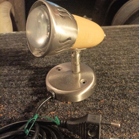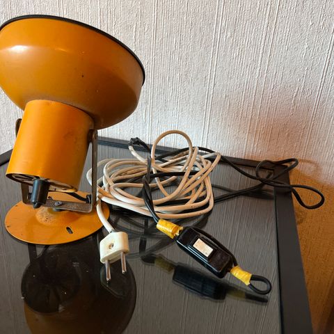 Retro musta seinävalaisin pitkällä johdolla. Ajan patinaa mutta yleisilmeeltään siisti.