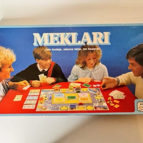 Peliin kuuluu rahaa, osakkeita, kysymys- ja ohjekortteja, kaksi noppaa ja erivärisiä pelinappuloita. Mukana ohjeet.