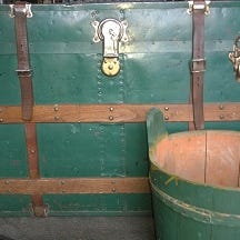 Vanha matka -arkku vihreä, ruskeat nahkaremmit, puulistat ja metallivahvikkeet.