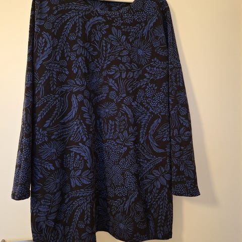 Nanso Indus naisten tunikamekko, koko XL, sininen väri. Mekossa on pitkät hihat ja kuvioitu kangas. Sopii arkipukeutumiseen.