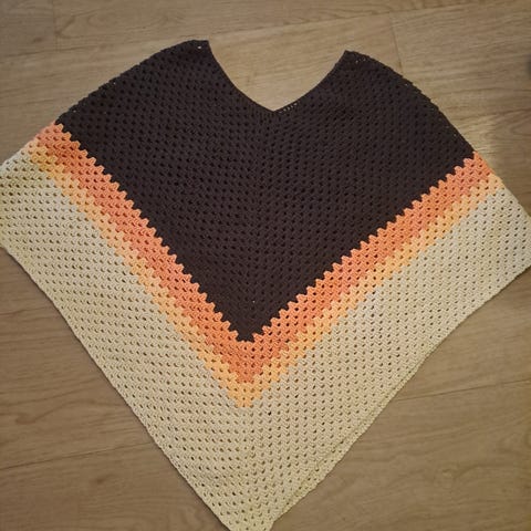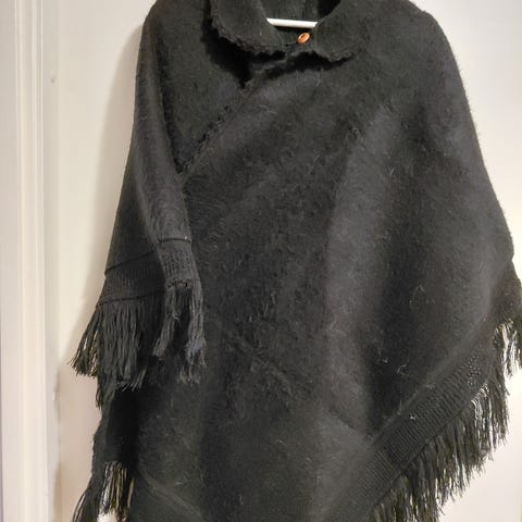 Todella kaunis, oranssi-musta poncho. Mielestäni poncho ommeltu kangaspuissa kudotusta villaneuleesta. Materiaali laadukas. Poncho jäänyt vähälle käytölle. Kaula-aukosta ponchon alareunaan n. 118 cm ja kaula-aukosta sivureunaan n.68 cm. Lämmin vaate niin ulko-kuin sisäkäyttöön. Maksu käteisenä. En postita.