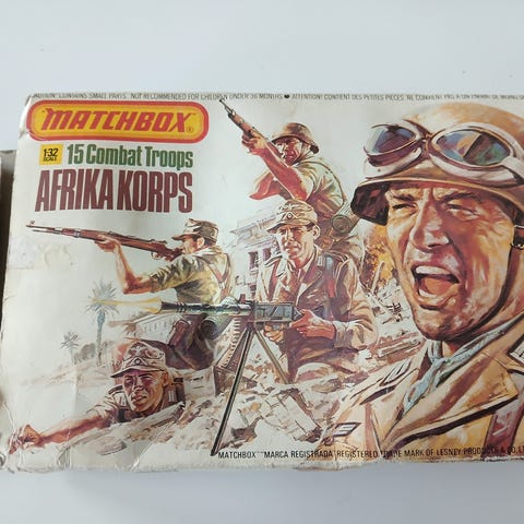 Harvinaisen hyväkuntoiset muovisotilaat Matchbox-sarjaa vuodelta 1983. Laatikossa jonkin verran pintavauriota, mutta itse sotilaat uutuuden kiiltäviä. Näillä vielä hiekkalaatikon aavikot koluamatta, samoin papattikeskitykset jääneet vielä väliin. Nouto/ postitus onnistuu. Myynnissä myös vastapuolen vastaava setti.