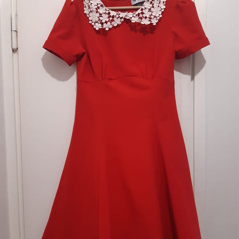 Kellohelma hulmuten töihin tai tanssimaan! Hieman polven alapuolelle ulottuva puhvihihainen mekko, punainen väri taittaa aavistuksen viininpunaisen suuntaan. Hutiostos: XS oli liian nafti itselle. Siis käytetty tuskin ollenkaan!