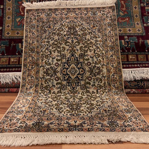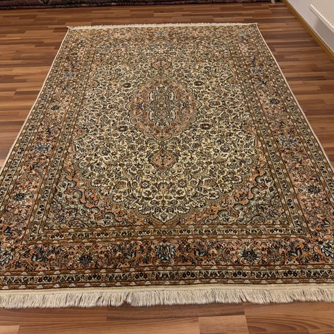 Upea käsin solmittu Kashmirin silkkimatto. Korkealaatuinen kudottu matto. Maton hapsut on kudottu puuvillasta ja kudos on 100 % silkkiä. Matto on 35/40 vuotta vanha ja täysin virheetön alkuperäinen silkkimatto.
