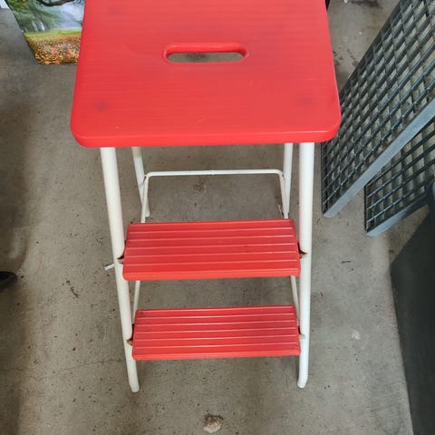Vintage puinen porrasjakkara suomalaiselta valmistajalta Lanka ja Muovi Oy, todennäköisesti 1960–70-luvulta.