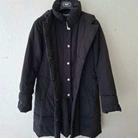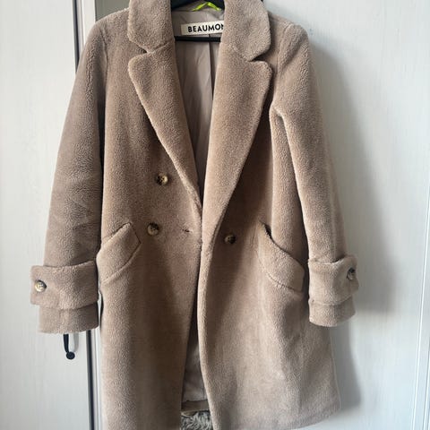 Laadukas lämmin talvitakki vaaleasta kestävästä polyesteristä, tikkivuori, teddykarvaa hupussa ja käännettävissä hihansuissa. Takana säädettävä selkävyö. Takissa vetoketju ja nappikiinnitykset ja somisteena yksityiskohtaiset ompeleet. Merkki Beaumont, Amsterdam.