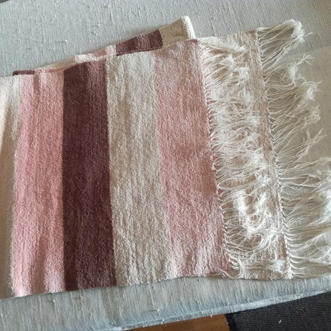 Kaunis ruskeasävyinen poppana-kaitaliina, jossa on vaaleita, ruskean ja beigen värisiä raitoja. Pituus on 96 cm ilman hapsuja ja leveys 43 cm. Hyväkuntoinen.