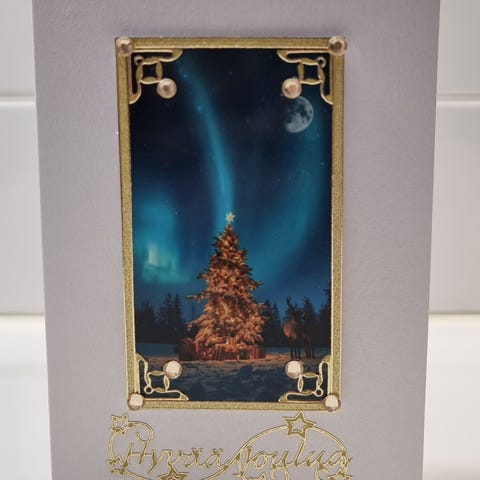 Joulukortti, jossa on revontulien ja talvimaiseman kuva. Kortti on koristeltu kullanvärisillä koristeilla ja siinä lukee "Hyvää Joulua". Kortti soveltuu joulutervehdyksiin.Itse tehty ja täysin uniikki. Sa toiveeni mukaan enemmän kpl. Ja myös jos jotain toiveita