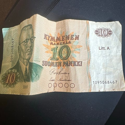 Kolikko on 10 markan rahaa, joka on lyöty Helsingissä Suomen puolustusaseman itsenäisyyden kunniaksi 6.12.1967. Setelissä on painatus Suomen Pankin tunnuksilla ja vuosiluvut 1917-1967.