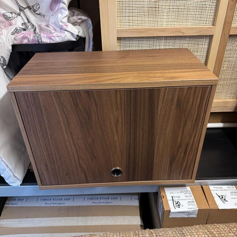 String Nils Strinning säilytyskaappi, valmistettu vaaleasta puusta. Kaapissa on liukuovet ja sisällä hyllytila.