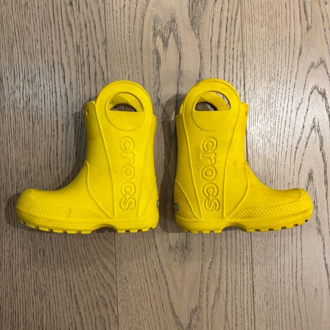 Crocs lasten kumisaappaat, koko 25, väri keltainen. Unisex-malli, valmistettu vedenpitävästä materiaalista. Soveltuvat lasten jalkineiksi kosteisiin ja märkiin olosuhteisiin.