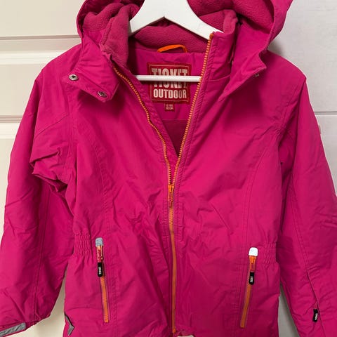 Tyttöjen musta talvitakki. Kunto hyvä, rinnassa yksi haalea tahra, joka ei lähtenyt psussa, tästä kuva liitteenä. Hupun karvareunus irrotettavissa.