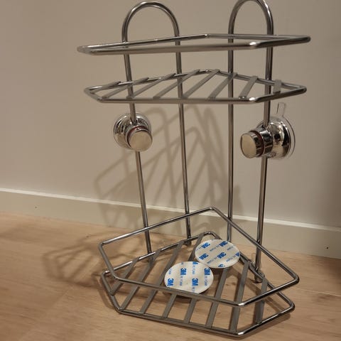 Tammiholma suihkukulmahylly kromi. Hyllyn korkeutta voi säätää 2300-2600 mm välillä. Putki alumiinia, korit lakattua terästä. Kaksi isompaa ja kaksi pienempää koria.