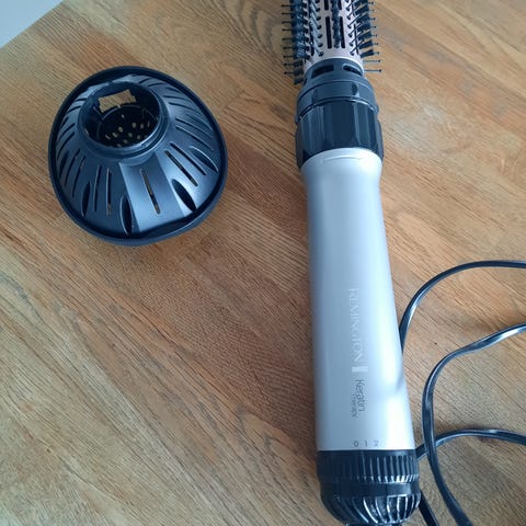 Remington ilmakiharrin, jossa vaihdettava pyöreä harjapää. Laitteessa on violetti runko ja musta harjaosa. Johdollinen malli, jossa on painikkeet lämmön ja/tai puhalluksen säätöön. Soveltuu hiusten muotoiluun ja kuivaamiseen . Tarkemmat tekniset tiedot, kuten teho ja lämpötila-asetukset, eivät käy ilmi kuvista.