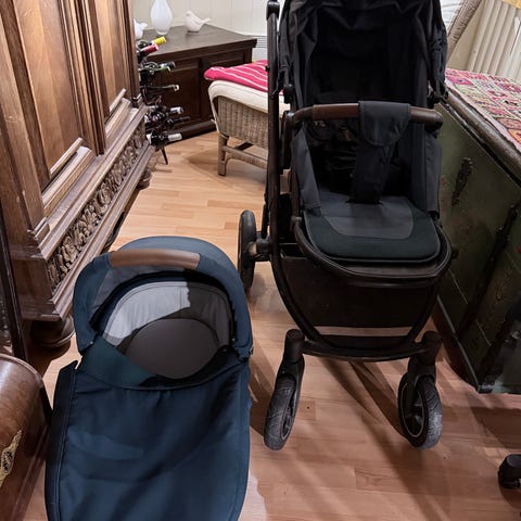 Siistit Britax smile lastenvaunut ruskealla kangaskankaalla. Vaunut sisältävät kopan ja istuimen. Runkokehys on musta ja siinä on säädettävä työntöaisa. Yhdessä renkaassa ei pysy ilma.
