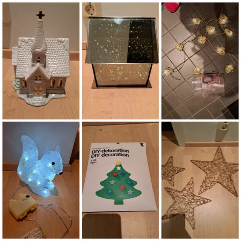 Vanhoja retrovaloja, pöytäliinoja. Joululehtiä, toisissa yleistä joulusta ja toisissa leivontaa. Ristipistotyö. Uusi avaamaton.