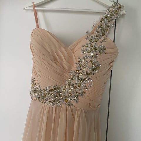 Myydään kerran käytetty, kuin uudessa kunnossa oleva kultainen, upea, spagetti-olkaiminen juhlamekko. Sai paljon kehuja käytössä, juhlapaikan timantti, joten täydellinen Vanhojen tansseihin tai Vuosijuhliin!✨
