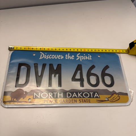 North Carolina First in Flight -rekisterikilpi, jossa numerosarja PAK-7987. Kilpi on sinisellä taustalla, jossa on vaurioita ja kulumaa, mikä antaa sille kuluneen ilmeen. sisustustaulu 31 cm x 15,5 cm