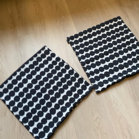 Myydään muuton alta 2 kpl räsymatto verhoja 254×136cm + 5kpl 50x50cm koristetyynynpäällisiä.