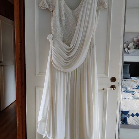 Upea vintage juhlamekko. Ostettu Irlannissa vintageliikkeestä. Kyseessä kapteenin vaimon juhlamekko 1920-luvulla. Taidokkaan yksinkertainen viimeistellyn toteutuksen. Kuva eivät tee tälle oikeutta. Väri on luonnonvalkoinen kultaisin kuvioin.