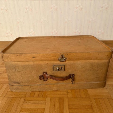 Myynnissä vanha vanerinen matkalaukku. Mitat 61 x 39 x 23 cm. Kunto on ikäisekseen hyvä. Nahkahihnan toisen pään kiinnitys on irti. Ensisijaisesti nouto, mahdollisesti myös kuljetus Tampereen seudulla.