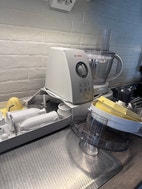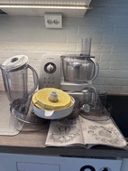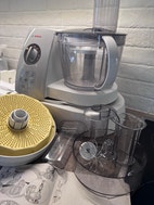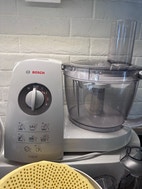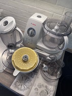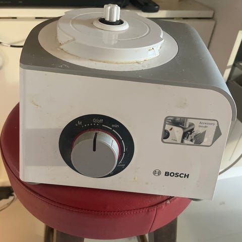 Bosch monitoimikone, valkoinen väri. Sisältää useita osia ja lisävarusteita kuten kulhoja, teriä ja blender-osan. Käytettävissä erilaisten ruokien valmistukseen kuten pilkkomiseen, sekoittamiseen ja mehustamiseen. Tämä on 16 -vuotta vanha, mutta toimii edelleen moitteetta. Ohjeet mukaan. Yksi kansista hieman haljennut (kuva), muttei vaikuta käyttöön.