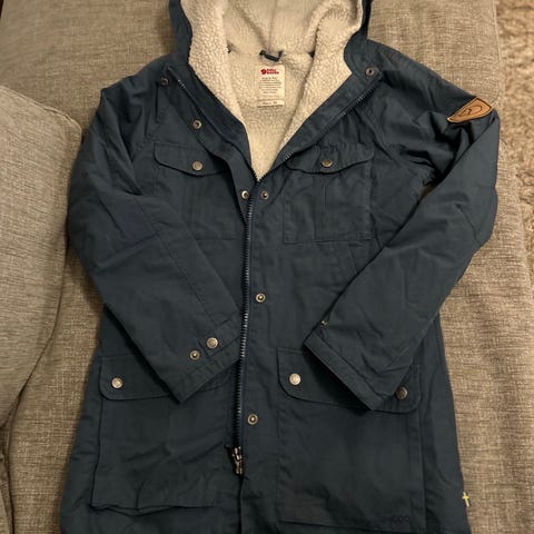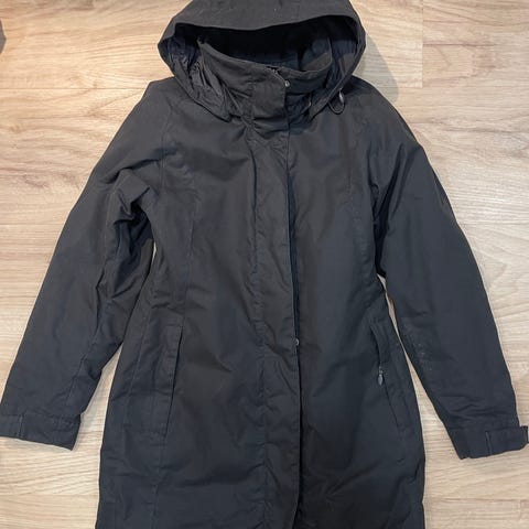 Lämmin talvitakki. Fleece vuorattu huppu,ilman karvareunusta. Takin sisäpuolella vyötärön kiristys mahdollisuus. Kaks isoa mesh taskua takin sisäpuolella.Kaks isoa läppätaskua nepparilla takin ulkopuolella, sekä käsien lämittelytaskut molemmin puolin. Iso puhelintasku ja kaksisuuntainen vetoketju. Peittää pyllyn. Menee koolle s ja silti varaa kerrostautua. Reilua mitoitusta koolle xs, vaikka kokolapussa on xs. Kainalosta kainloon 50cm ja olkapäästä alahelmaan 74cm.