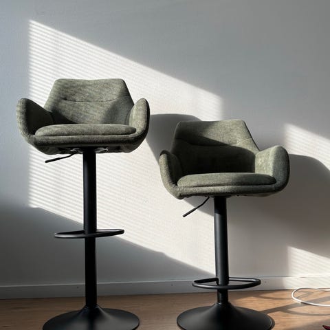 Designer baarituolit Vepsäläiseltä. Toisessa tuolissa pieni rispaantuminen. Ei häiritse istumista.