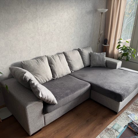 'Vikoina' käsinojan kankaassa vekki (ollut siinä 3 vuotta) + nurkkatyyny 'lysyssä', mutta näistä saa päälliset irroitettua ja sisälmykset muotoiltua mikäli haluaa. Tekstiilipesurilla hinkkailtu vuosittain mutta nyt ei motivaatio siihen enään riitä :D Pesurilla sohvasta saa siis ihan uudenkarhean näköisen aina.