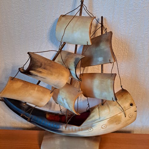 Pienoismalli purjeveneestä, valmistettu puusta ja kankaasta. Veneen pituus noin 50 cm. Mallissa on valkoinen runko, punainen pohja ja luonnonvärinen purje. Soveltuu koristeeksi tai keräilyesineeksi.