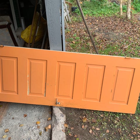 Vanha puinen peiliovi jonka mitat ovat189x79.5 ja vahvuus 4.2. Lukko ja saranat ovat ovessa .Maali pinta lohkeilee näkyy kuvissa. Puuosat ovat ehjiä.