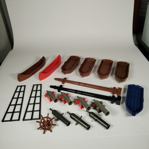 Legon merirosvosetti. Takana olevalla vivulla voi "heiluttaa" laivaa kuin se olisi laineilla. Kaikki osat pitäisi olla tallella. Kädessä oleva kaukoputki kuuluisi laivan keulaan.