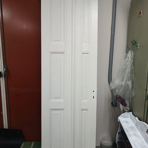 Leveys 82,5 cm ja korkeus 150,5 cm. Vanha varaston ovi, käsittelemätön. Mukaan saranat ja avain.