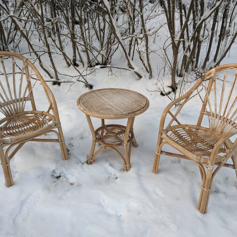 Myydään rottinkipöytä ja kaksi tuolia. Käytönjälkeä on ja ovat jonkun maalaamat. Pöydästä on maalattu lasikin, mutta itse pidin pöytäliinaa päällä. Pehmusteet saa mukaan (mutta ei valkoisia päällispyyhkeitä). Nouto, 7km keskustasta.